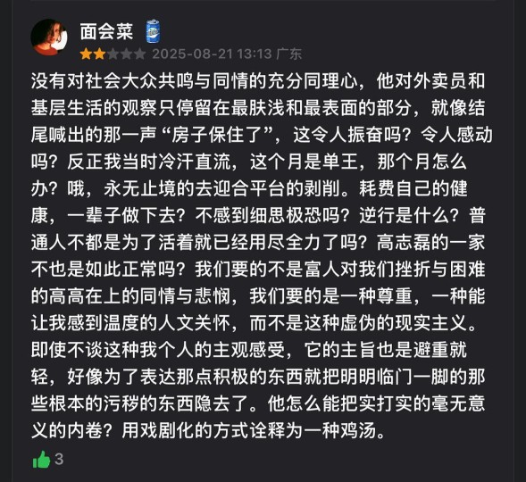 送外卖帮带东西帮丢垃圾这事就是错的,这是一种职业上的压榨和歧视,在交通法边缘游走,在正常取餐送餐之间允许卑躬屈膝一样不平等接触存在,反复蹂躏自己的自尊去接受平台无情且无休止的算法?事实上无论是外卖还是滴滴司机,大数据真的会分析时间地点成本和盈利,真的会造成,你跑的越多单次盈利越低,无限趋同的结果,最后谁送的相对少送的相对慢就会被算法设定为“不上进”普通电影里表现得那样,遵守交通规则,遵守正常线路,遵守各个取送餐地方的规定,那么该外卖员从系统上看就是不赚钱的不思进取的人!那么所谓的单王榜单其实就是违法违规的屠宰榜单!这种社会现象对吗?每天工作八小时,要求上班前早到一小时,下班义务加班,这不是社会病态?要求员工自愿签署放弃缴纳社保这也能歌颂吃得苦中苦?单位食堂用陈米还有沙子,是不是也要歌颂单位免得给饭吃不应该挑三拣四?就去拍成电影不仅不质疑这种问题,还宣扬面对这种社会要容忍,要接受,甚至赞扬互相内卷后的身心都疲惫,一脸伤痕和病态的站着的人!?按照这思路韩国《熔炉》那样的电影是不是就应该拍成小女孩被欺负,然后容忍了,接受,“愿意献身”最后长大离开那个地方,在回忆一下自己当然被欺负自己忍下来是多么值得??送外卖是一份工作。跟任何其他工作一样,没什么不同,请问,谁愿意自己的工作支撑不起自己的尊严?电影本身丝毫没有去纠正这种压榨的现象,反而在歌颂压根不应该存在的认为的苦难!我没送过外卖,我只是觉得无论是电影本身还是电影中的社会现象都很低级!电影真的很难看