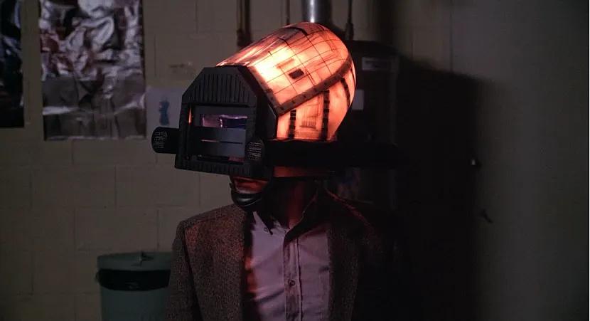 《录影带谋杀案》不仅将我们引入一个逻辑严谨却又荒诞离奇的迷宫系统,还展现了一种说书人般的亲切和人性化的特质。日常的电视体验究竟是如何变得诡异不安的?对柯南伯格来说,只需借助一个现实主义布景、几处细节描写、一场戏和几个镜头,便能将我们带入另一个世界:麦克斯最终登上的那艘生锈的船、“阴极射线布道会”内迷宫般的屏风、那间(配有幻觉头盔的)崭新眼镜店所改装成的破旧商店,还有奇观光学公司总裁布莱恩·康维斯——这位《录影带谋杀案》中虚构的“戴眼镜的男人”,让人不禁想起霍夫曼童话中的“睡魔”。