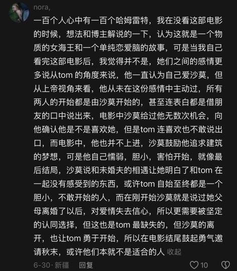 观点2: 男主跟大部分人一样 缺乏安全感却又不敢主动表达 让女生一步步做出离开的选择。 是的 这个观点跟第一个观点相差真的很大 但是听完解说之后我也是真的茅塞顿开。 男主并不主动 这是真的 在电梯里summer主动开口与其说话也没有很大的反馈;天天在那里胡思乱想却并没有实际行动 跟朋友倾诉自己和summer的对话且曲解意淫出对方的不好 朋友让其约她出来 男主也是怂直接说别犯傻了 这点真的没有任何实际行动;在酒吧聚餐完之后也不敢主动表达好感 只好说做朋友;第二天上班summer主动献吻也毫无表示;女性summer在这段感情里是最缺乏安全感的那一个 因为男主从始至终都没有说过我喜欢你 在床上暧昧的时候 summer说我不想太认真 男主也直接说可以无所谓 只要开心就好 没有给对方安全感;在酒吧里被骚扰了 男生也不敢主动上前帮忙摆平 却因为一句被伤自卑的话忍无可忍 这样也确实理解了女生生气的点;双方因为这个事情生气了之后 男主也不敢打电话认错 没有主动的勇气 还是女方自己上来say sorry的;在草坪中那段summer主动引导男主喊“丁丁”“老二”“牛子”的情节 真的已经可以理解为summer想让男主主动勇敢一点 说出自己想要的关系。 如果还不够理解summer的 可以继续看我接下来的分析:男主是想学建筑设计的 但是毕业之后也一直在写信公司工作 原因是他没有主动放弃一个工作从头来过的勇气 不好听的就是得过且过 男主不差 在公司是最被老板欣赏的 画画也很好看 就是没有勇气;前面很多意淫和后面那段男主去summer家的派对(期待与现实)表明了男主从始至终都没有勇气去面对这样的事情 因为生活一直顺风顺水;看电影不理解电影后面对抢婚之后超长片段的含义 summer在看完那个电影之后流泪也正是要和男主渐行渐远 看破一段关系的时候。(那个阶段的自己不够强大,不够主动,忽略了她最想要的。)summer一直以来都想要男主的坚定选择 但是全片下来男主的懦弱从来都没有坚定的选择对方 并且付诸实践。最后summer与男主在椅子上还碰男主的手 其实也是说明了她一直都爱着男主 但是男主从来都不够勇敢与坚定 没办法 他俩不是一路人。 最后结局是的 男主因为这段关系开始改变自己 放弃了现在的工作开始追求梦想 面对新的关系也主动出击 他最终还是改变了。 总结: 面对一段关系的时候我们需要勇敢表达并且付诸实践 女生会被诚意所打动的 当然我们需要自己能够左右自己的生活和有自己的想法的时候爱情就会到来。