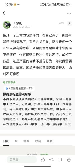 这个影片已经不能用闹心来形容了,影片本身内容差到极致,这一点我在之前的影评里已经详细说明了,这个片子的部分粉丝也是极度不可理喻,评论一句质疑就被用恶言辱骂,辱骂完了之后我被迫反击,他反而成受害者了,真是高,高啊!被骂的人成了加害者,骂人者成了受害者,这本来这影片就是0.5分的影片,现在好感完全败光,0.5分可以四舍五入成0分了!一个自称历史专业的人写的影评里一众标准中权重最低的居然就是历史,情怀占了绝大多数,任何正常人都会质疑,质疑的结果就是从第一句开始就是用脏话谩骂,是可忍孰不可忍?还自称是捍卫自己自由评分的权利,还能拔高到如此程度,你的评论区容不得不同声音就是容不得呗,只发了一句评论就能用脏话辱骂,居然还能弄上看似高尚的理由了。最让人无法理解的就是,我明明一开始只发了一句对他明明褒的部分很少,贬的很多,就质疑这么一句他就骂人,那我当然不干了,最后就话赶话发了40多条评论,但问题是,你一开始能说你是捍卫你自由评分的权利吗?如果不是你不断辱骂,会变成40多条评论吗?会构成现在所谓的对你评分的干涉的表象吗?说到底就是你在干涉我自由评论的权利,并进行网络暴力导致的。另外建议,口才这么好可以用到正道上。 你除了拿法律恐吓还会啥?但问题是这恰恰暴露你对法律一无所知。 来看看我之前转发的文案: