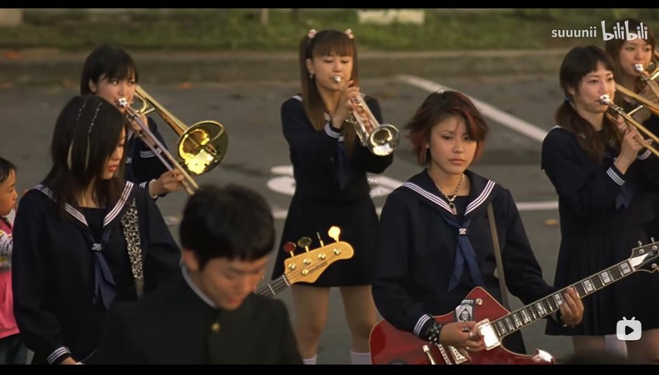 画面太美:小河的对岸你和我,窗前微风拂衣角、冬日雪地奔跑打闹、敲锣打鼓喜气洋洋的车厢、姗姗来迟时冻得红扑扑的脸蛋…… 情感太纯粹:为了逃课而胡闹而排练、只是“夏令营的关系”而纠结是否上前搭话、想买乐器就咋咋呼呼打工、在电梯里集体热吻男模、忘记邮寄录像带而拖累团队想坦白却迟迟无法开口……很经典的治愈系日漫,很美好的群像写生,叫得上名字的人物基本都有自己的动机和细节,寥寥几笔也能勾勒出其完整的故事线——从夏天摇摆到冬天。 电影中的少女形象更是极其鲜活,不同于常见叙事中片面突出其单纯懵懂、柔软善良,而是更立体和生动。少女还是狡黠的、好色的、任性的、顽皮的,也是勇敢的、坚韧的。